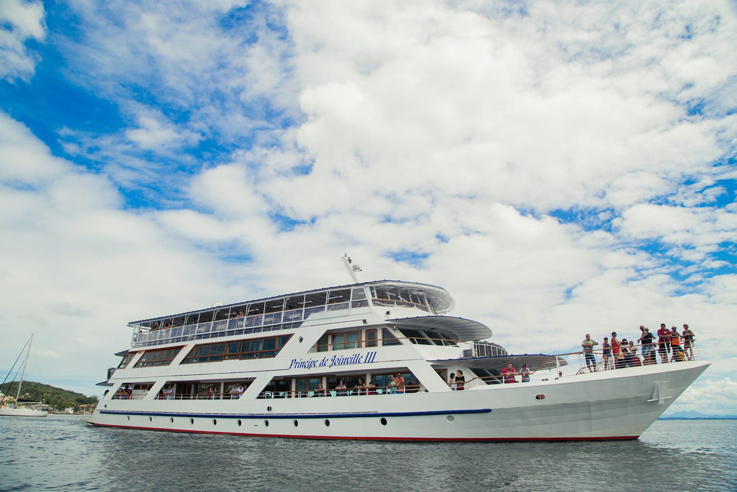 Passeio com almoço incluso no Barco Príncipe, navegando pela Baía da Babitonga, com paisagens naturais e parada na histórica cidade de São Francisco do Sul.